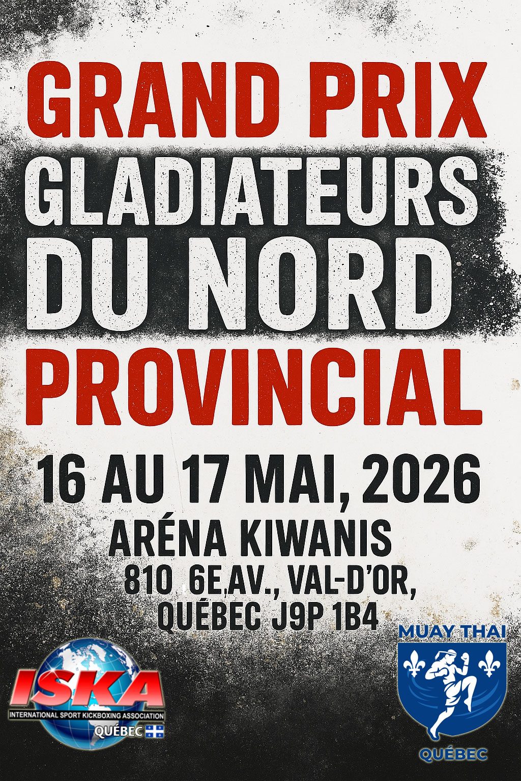 Grand Prix Gladiateurs du Nord Provincial mai 16 @ 8:00 am - mai 17 @ 5:00 pm EDT Aréna KIWANIS 810 6e Av.,Val-d'Or,Québec,Canada Le Grand Prix Gladiateur du Nord à Val-d’OrChampionnat de K-1 & Kick-BoxingPrêt à vivre des combats incroyables ? Le Grand Prix Gladiateur […]